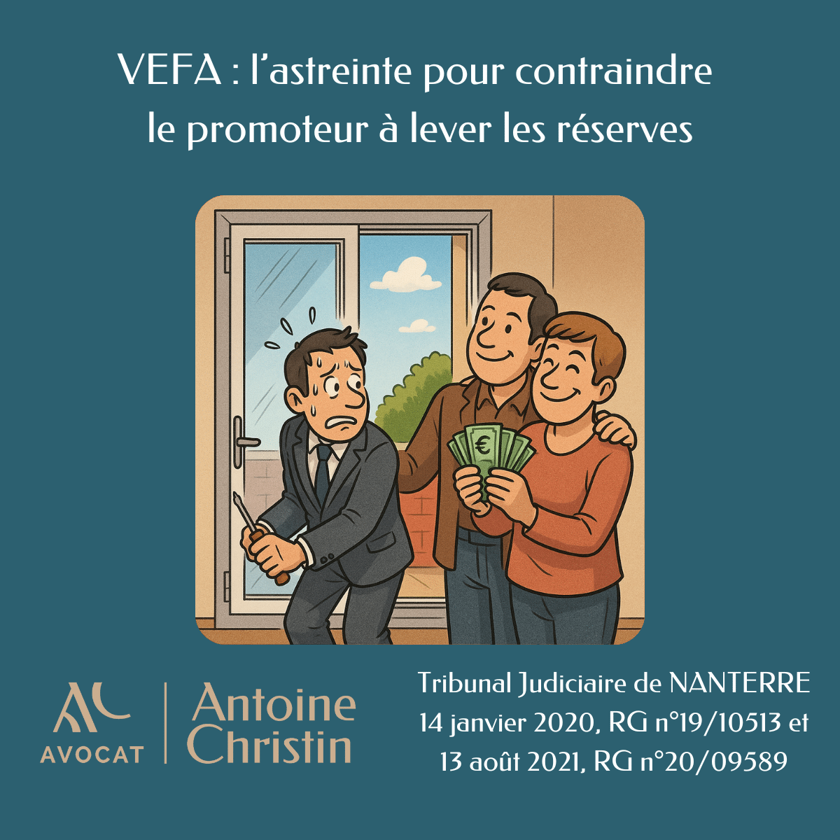 Par exemple : il arrive que le Président du Tribunal Judiciaire de NANTERRE condamne directement un promoteur à reprendre les menuiseries extérieures d’un appartement neuf sous astreinte. Il arrive également que le Juge de l’Exécution de NANTERRE, constatant l’inexécution du promoteur, liquide l’astreinte de manière sévère (22.000 € de liquidation d’astreinte + 2.000 € de contribution aux frais d’avocat).